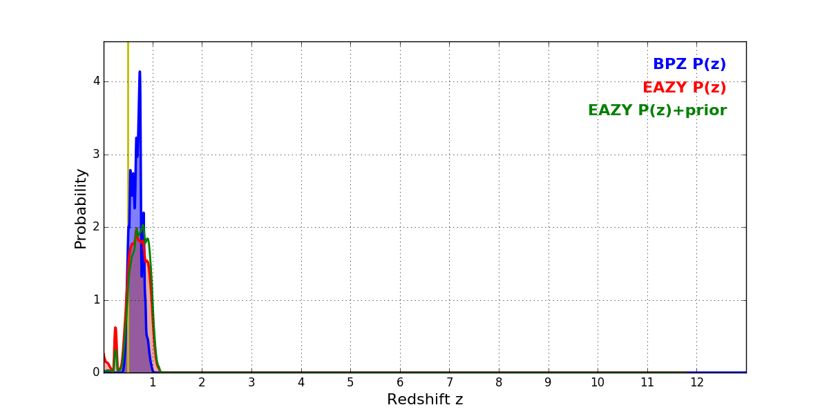 In P(z) plots: Yellow lines mark the cluster redshift z = 0.505,