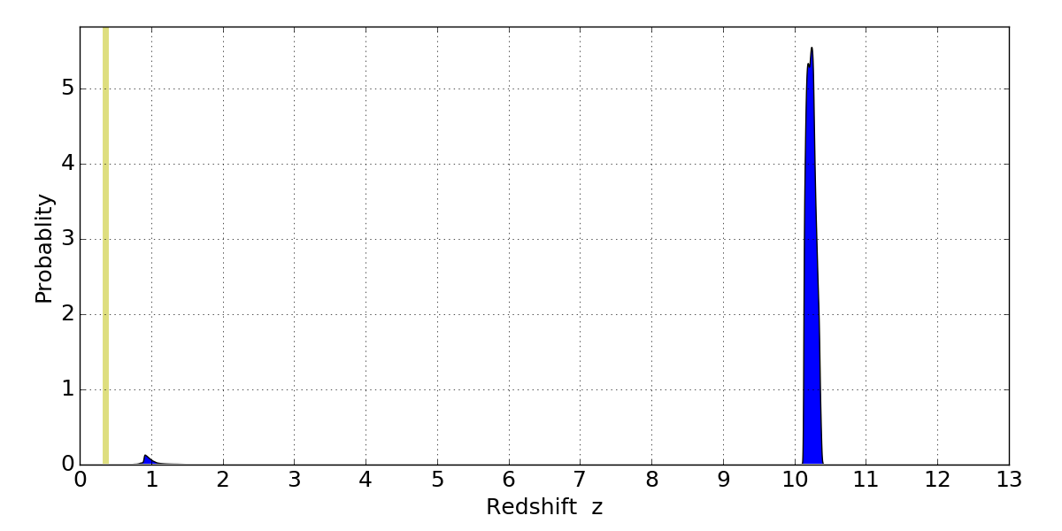 In P(z) plots: Yellow lines mark the cluster redshift z = 0.356,
