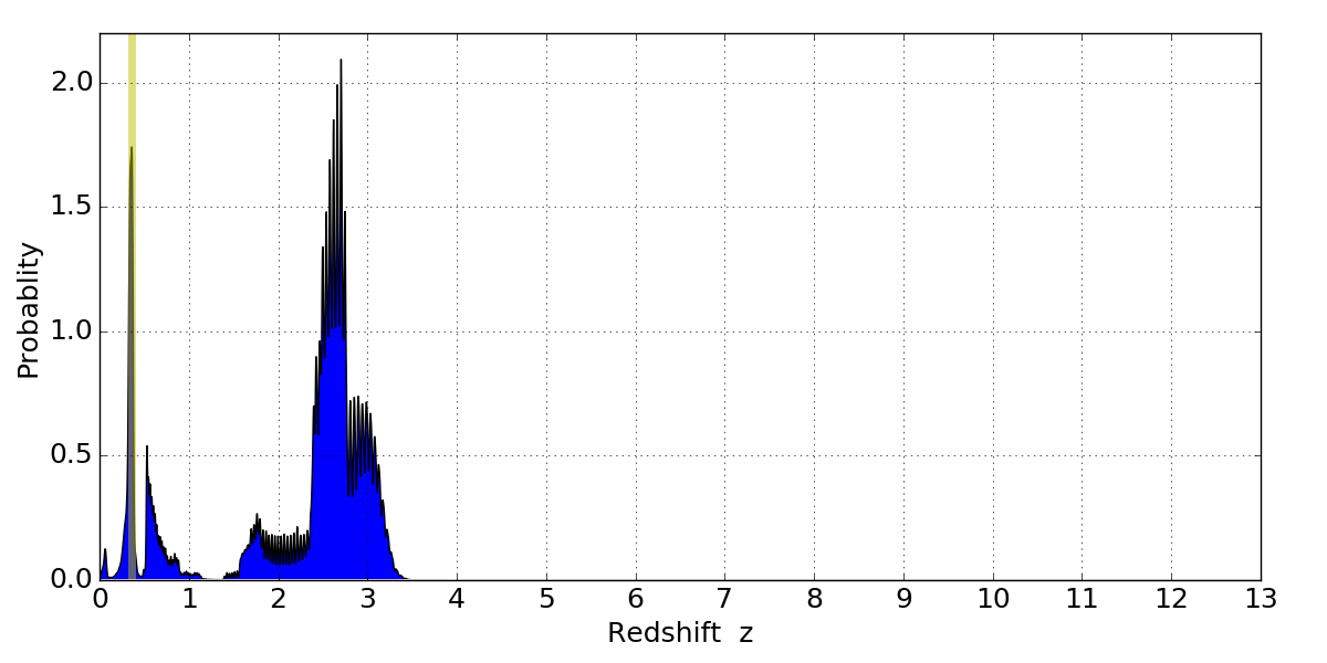 In P(z) plots: Yellow lines mark the cluster redshift z = 0.356,