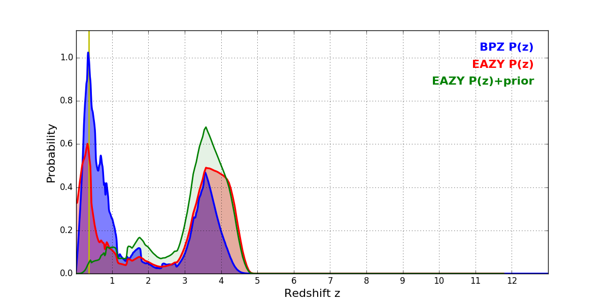 In P(z) plots: Yellow lines mark the cluster redshift z = 0.356,