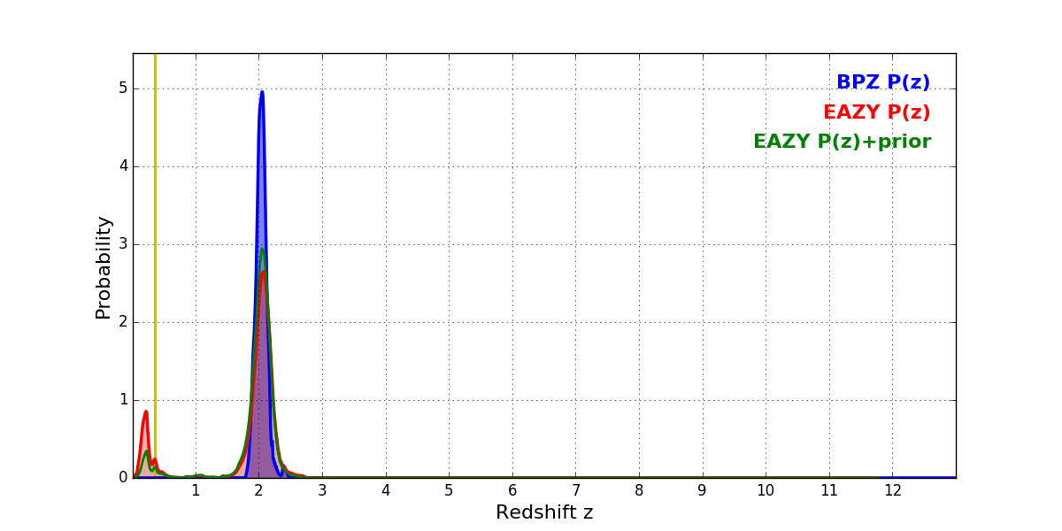 In P(z) plots: Yellow lines mark the cluster redshift z = 0.356,