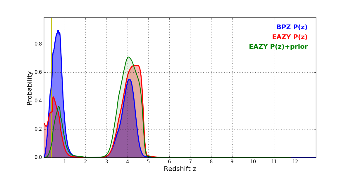 In P(z) plots: Yellow lines mark the cluster redshift z = 0.356,