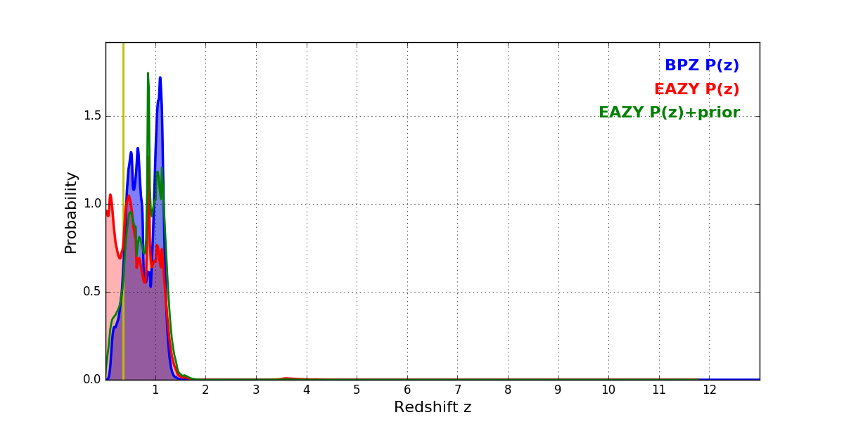 In P(z) plots: Yellow lines mark the cluster redshift z = 0.356,