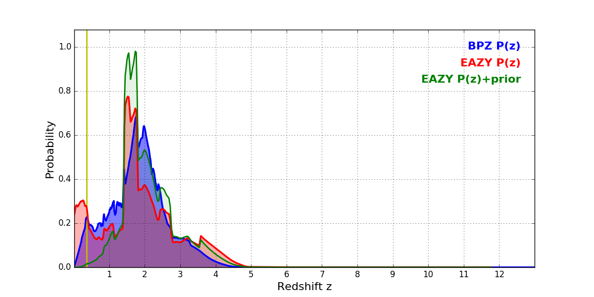 In P(z) plots: Yellow lines mark the cluster redshift z = 0.356,