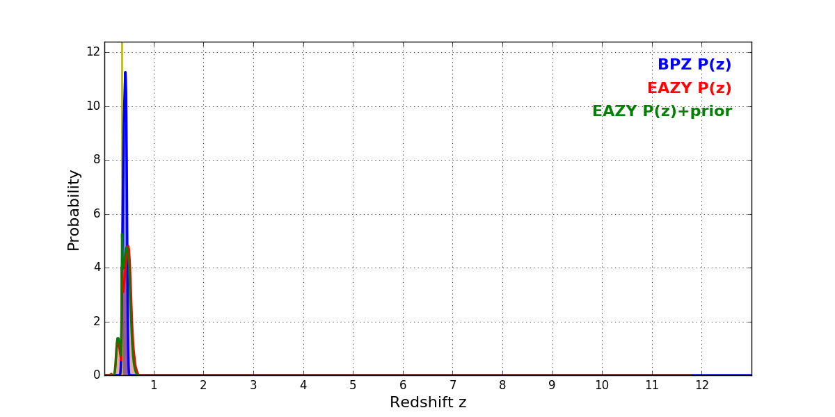 In P(z) plots: Yellow lines mark the cluster redshift z = 0.356,
