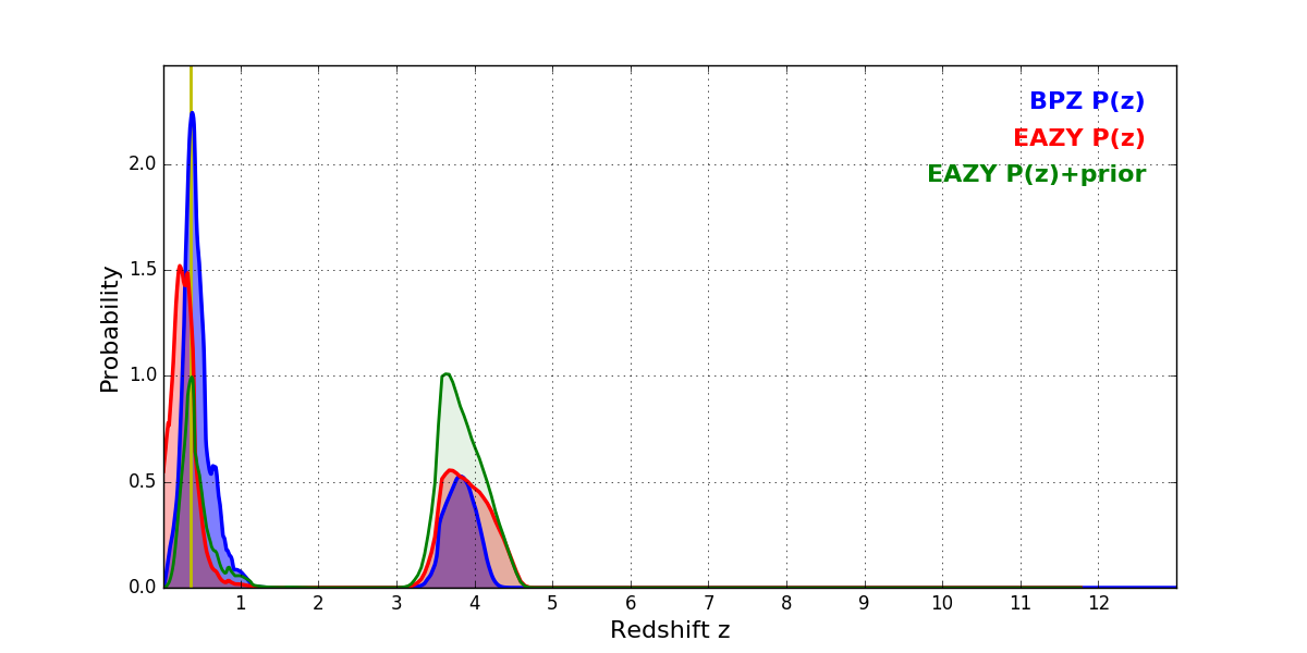 In P(z) plots: Yellow lines mark the cluster redshift z = 0.356,