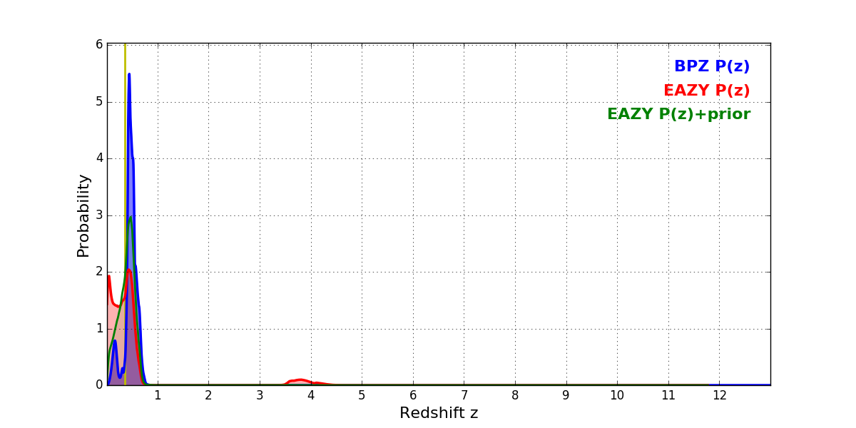 In P(z) plots: Yellow lines mark the cluster redshift z = 0.356,