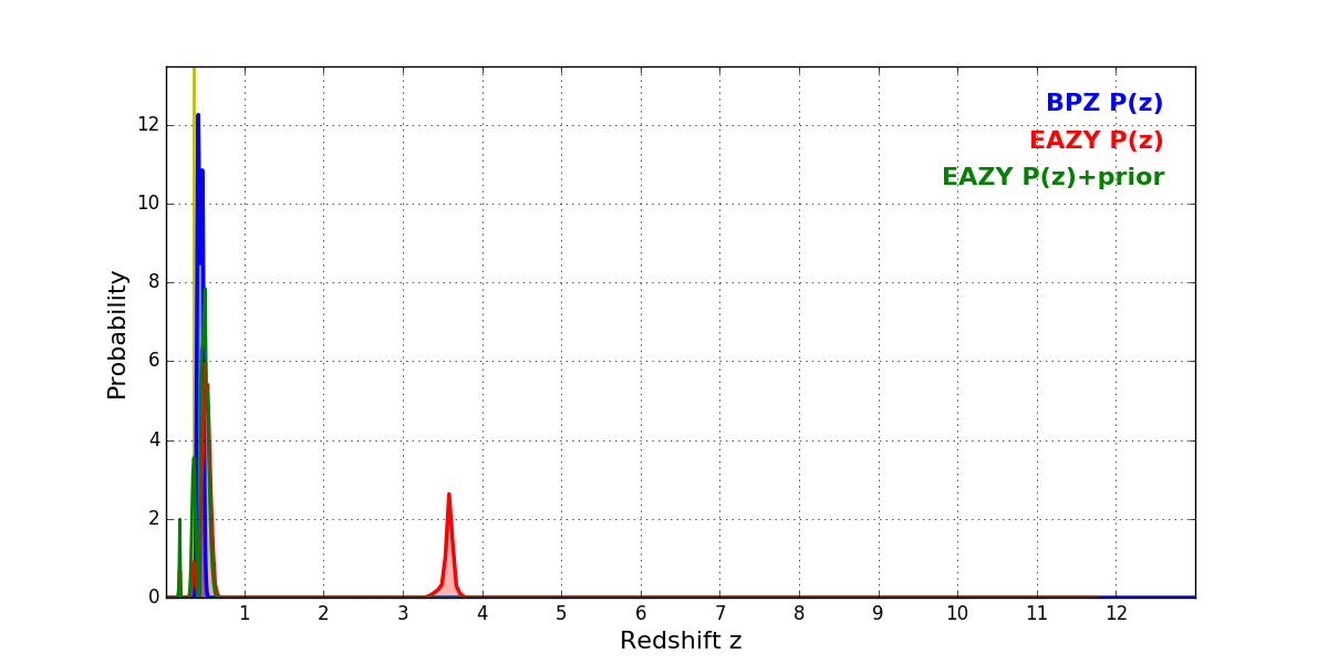 In P(z) plots: Yellow lines mark the cluster redshift z = 0.356,