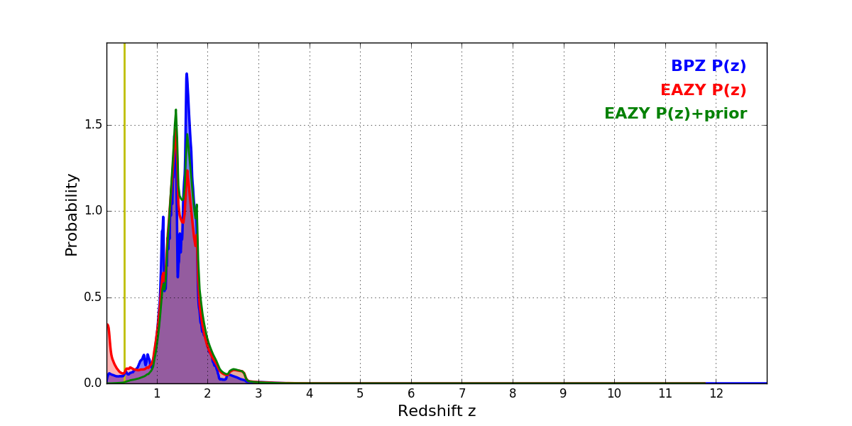 In P(z) plots: Yellow lines mark the cluster redshift z = 0.356,