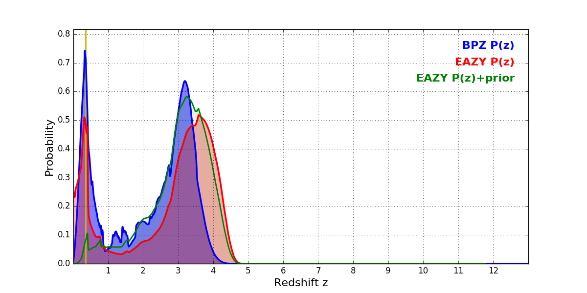 In P(z) plots: Yellow lines mark the cluster redshift z = 0.356,