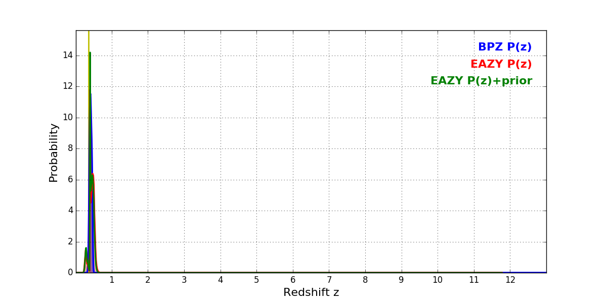 In P(z) plots: Yellow lines mark the cluster redshift z = 0.356,