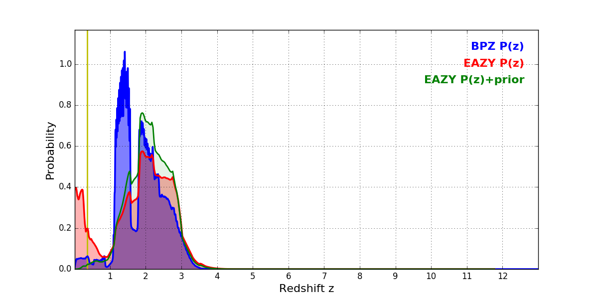 In P(z) plots: Yellow lines mark the cluster redshift z = 0.356,