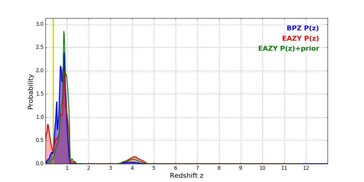 In P(z) plots: Yellow lines mark the cluster redshift z = 0.356,