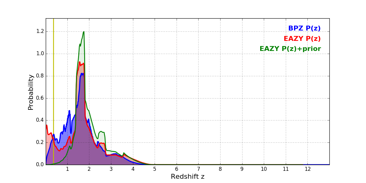 In P(z) plots: Yellow lines mark the cluster redshift z = 0.356,