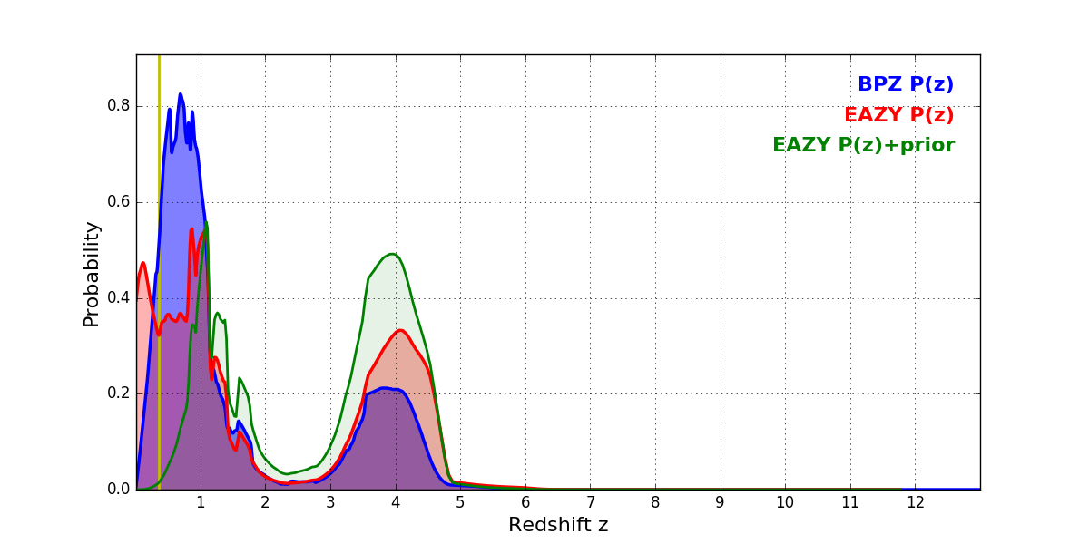 In P(z) plots: Yellow lines mark the cluster redshift z = 0.356,