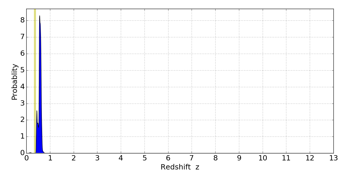 In P(z) plots: Yellow lines mark the cluster redshift z = 0.356,