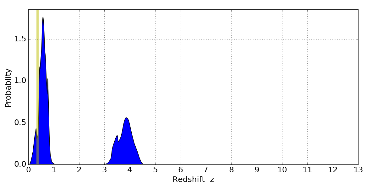 In P(z) plots: Yellow lines mark the cluster redshift z = 0.356,