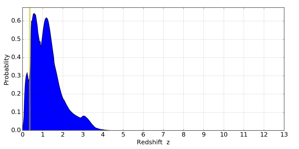 In P(z) plots: Yellow lines mark the cluster redshift z = 0.356,