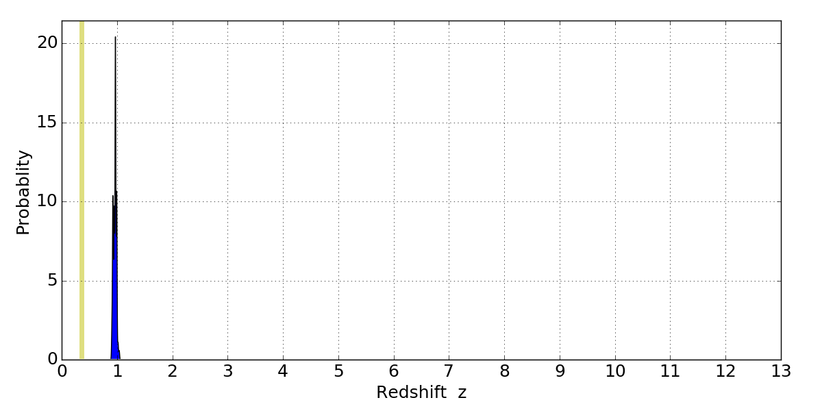 In P(z) plots: Yellow lines mark the cluster redshift z = 0.356,
