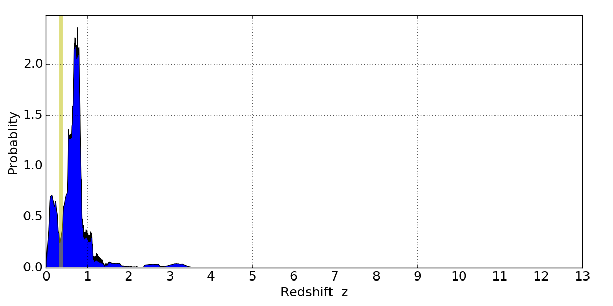 In P(z) plots: Yellow lines mark the cluster redshift z = 0.356,