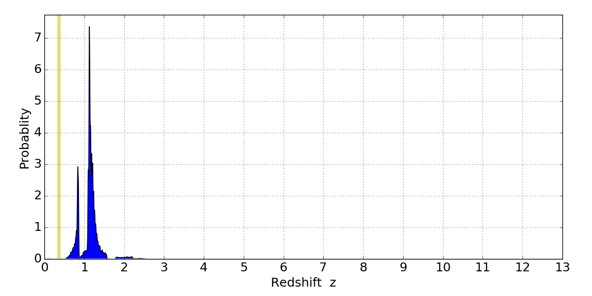 In P(z) plots: Yellow lines mark the cluster redshift z = 0.356,