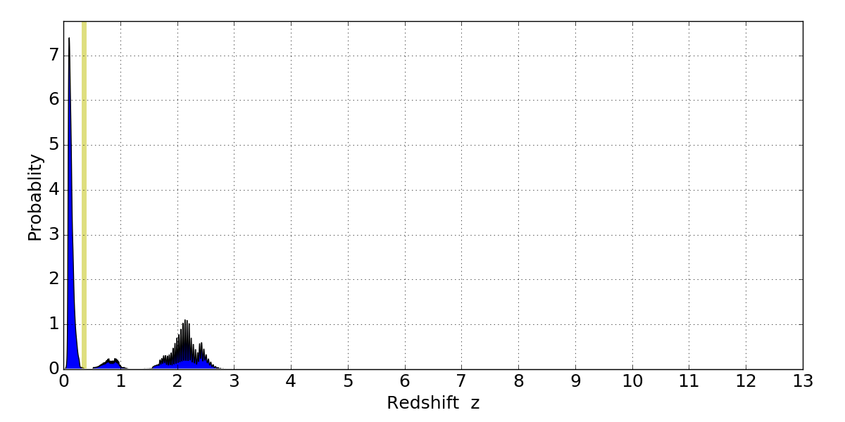 In P(z) plots: Yellow lines mark the cluster redshift z = 0.356,