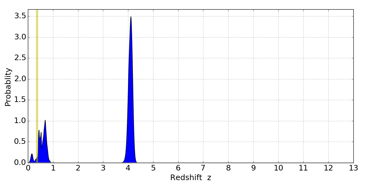 In P(z) plots: Yellow lines mark the cluster redshift z = 0.356,