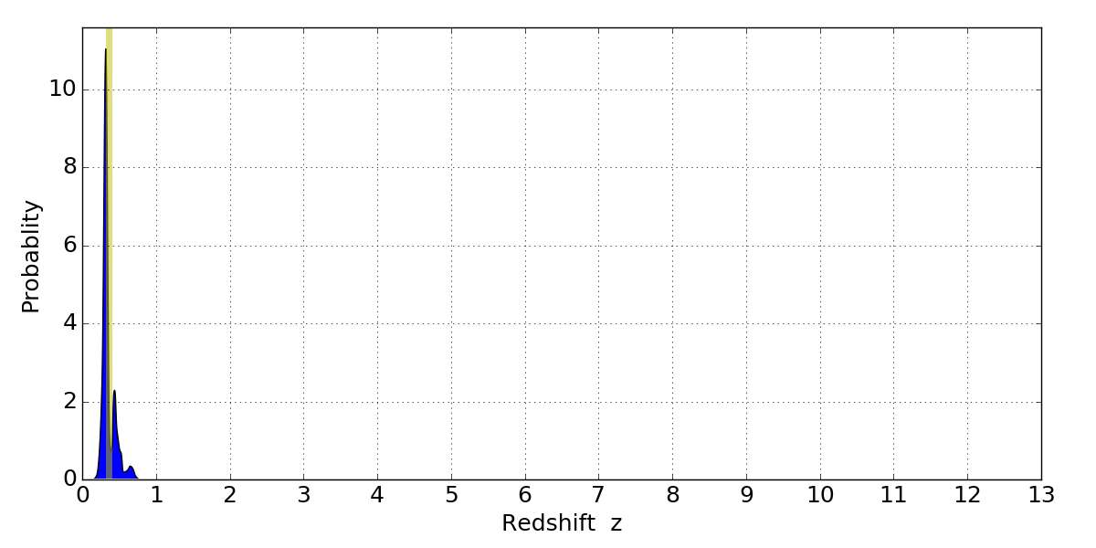 In P(z) plots: Yellow lines mark the cluster redshift z = 0.356,