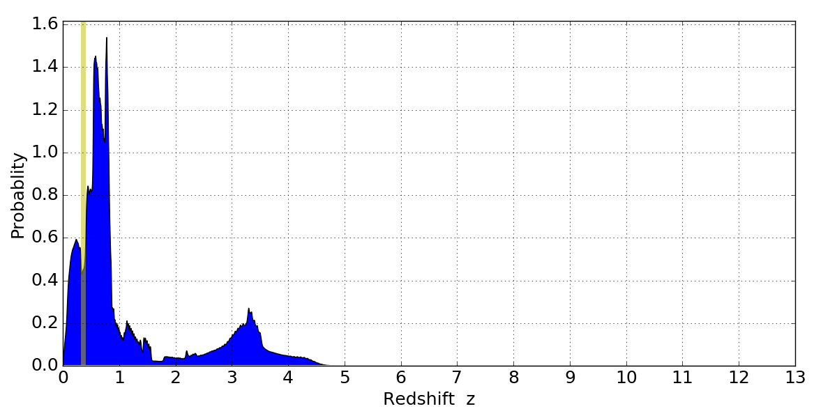In P(z) plots: Yellow lines mark the cluster redshift z = 0.356,