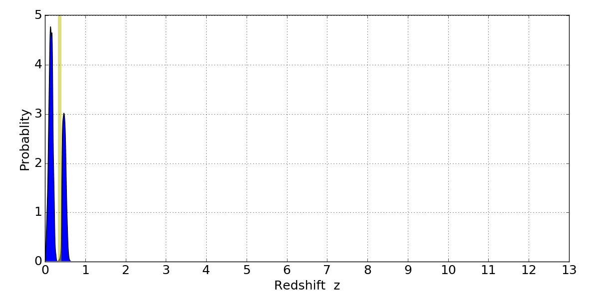 In P(z) plots: Yellow lines mark the cluster redshift z = 0.356,