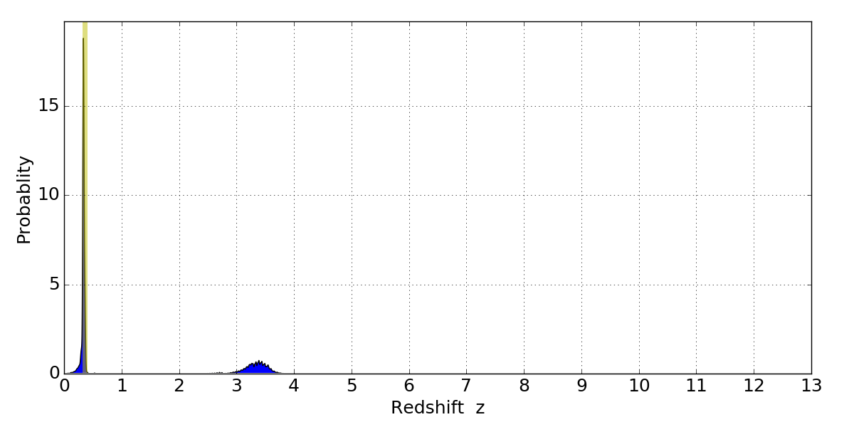 In P(z) plots: Yellow lines mark the cluster redshift z = 0.356,