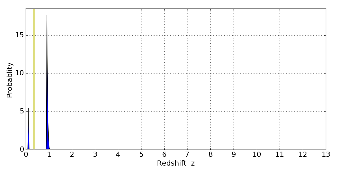 In P(z) plots: Yellow lines mark the cluster redshift z = 0.356,
