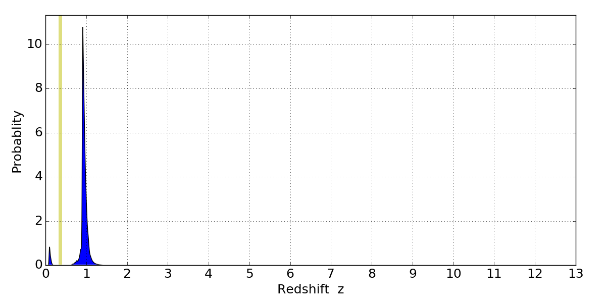In P(z) plots: Yellow lines mark the cluster redshift z = 0.356,
