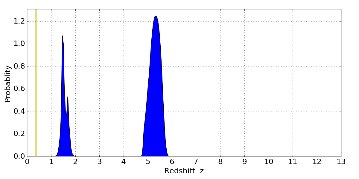 In P(z) plots: Yellow lines mark the cluster redshift z = 0.356,