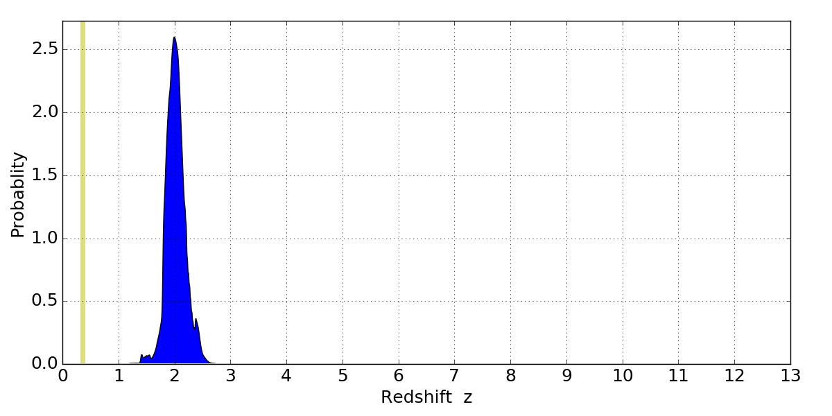 In P(z) plots: Yellow lines mark the cluster redshift z = 0.356,