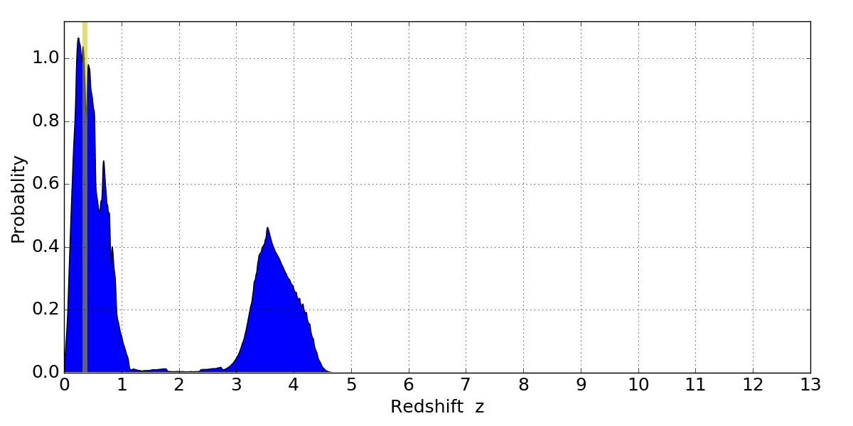 In P(z) plots: Yellow lines mark the cluster redshift z = 0.356,