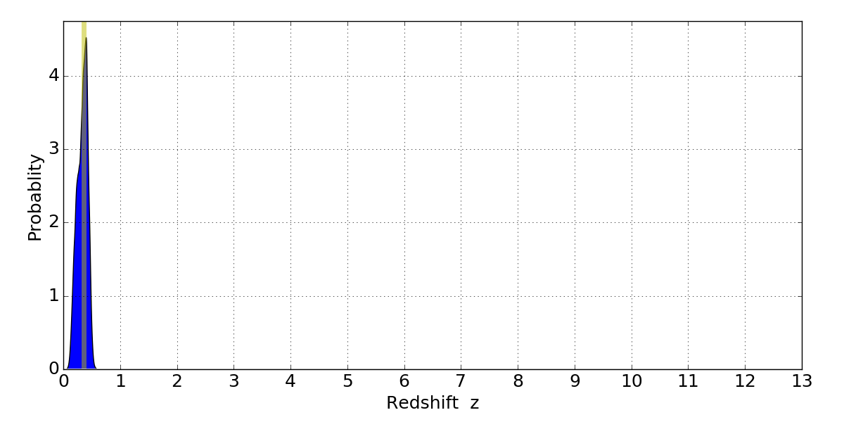 In P(z) plots: Yellow lines mark the cluster redshift z = 0.356,