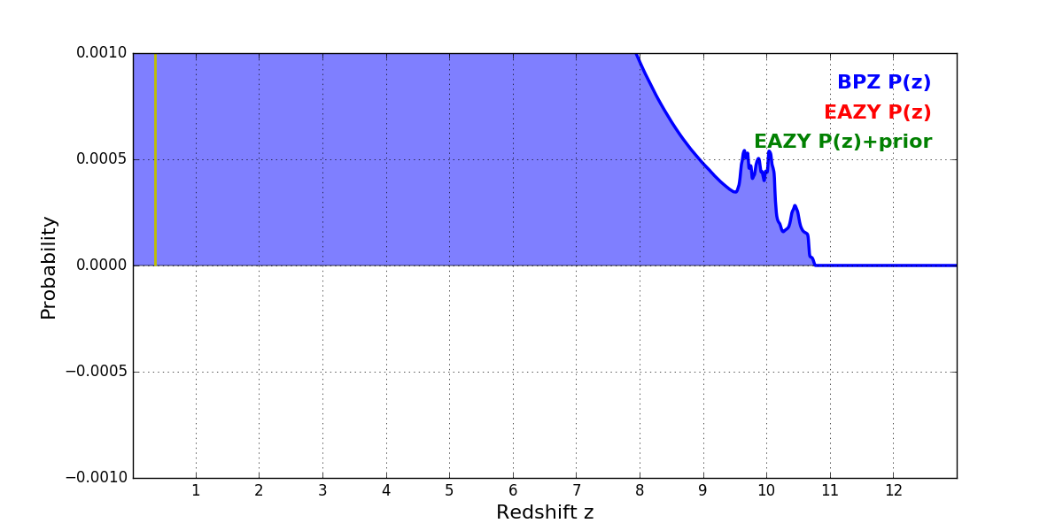 In P(z) plots: Yellow lines mark the cluster redshift z = 0.356,
