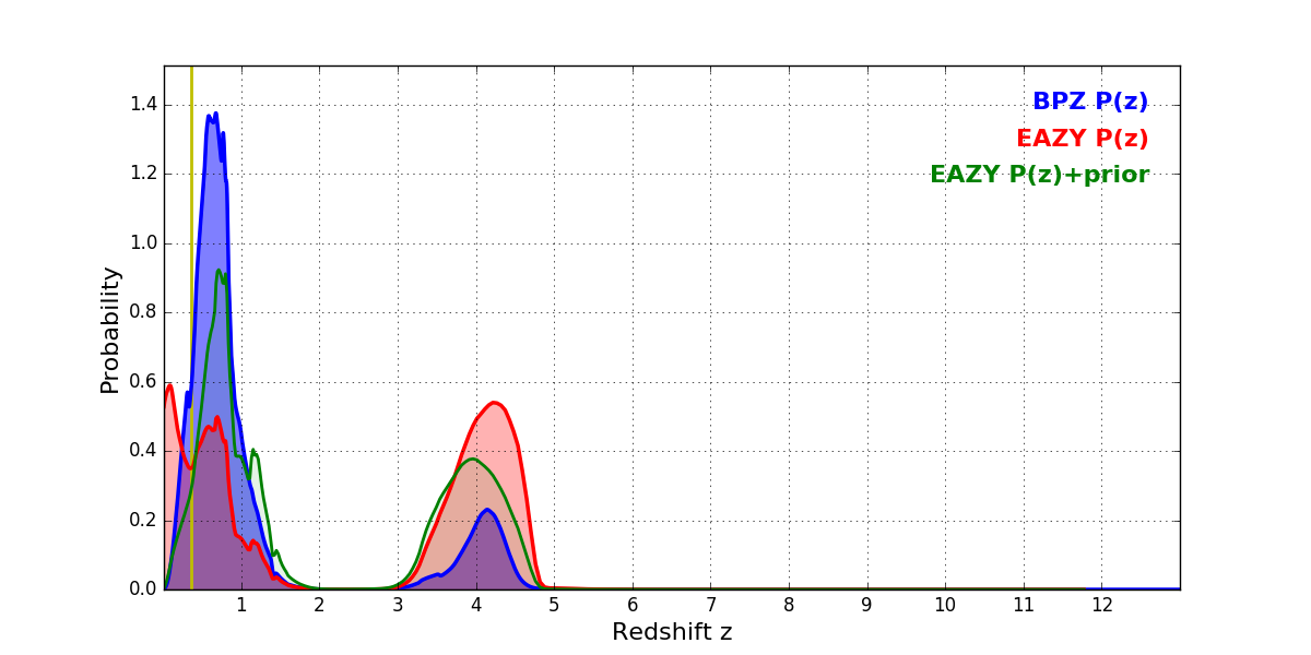 In P(z) plots: Yellow lines mark the cluster redshift z = 0.356,
