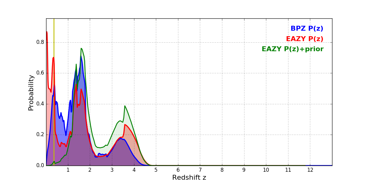 In P(z) plots: Yellow lines mark the cluster redshift z = 0.356,