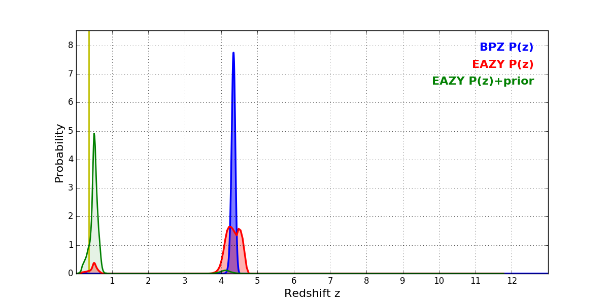 In P(z) plots: Yellow lines mark the cluster redshift z = 0.356,