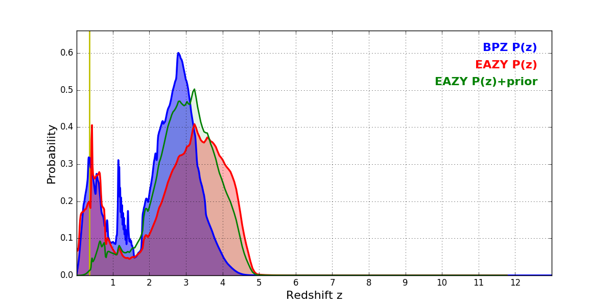 In P(z) plots: Yellow lines mark the cluster redshift z = 0.356,