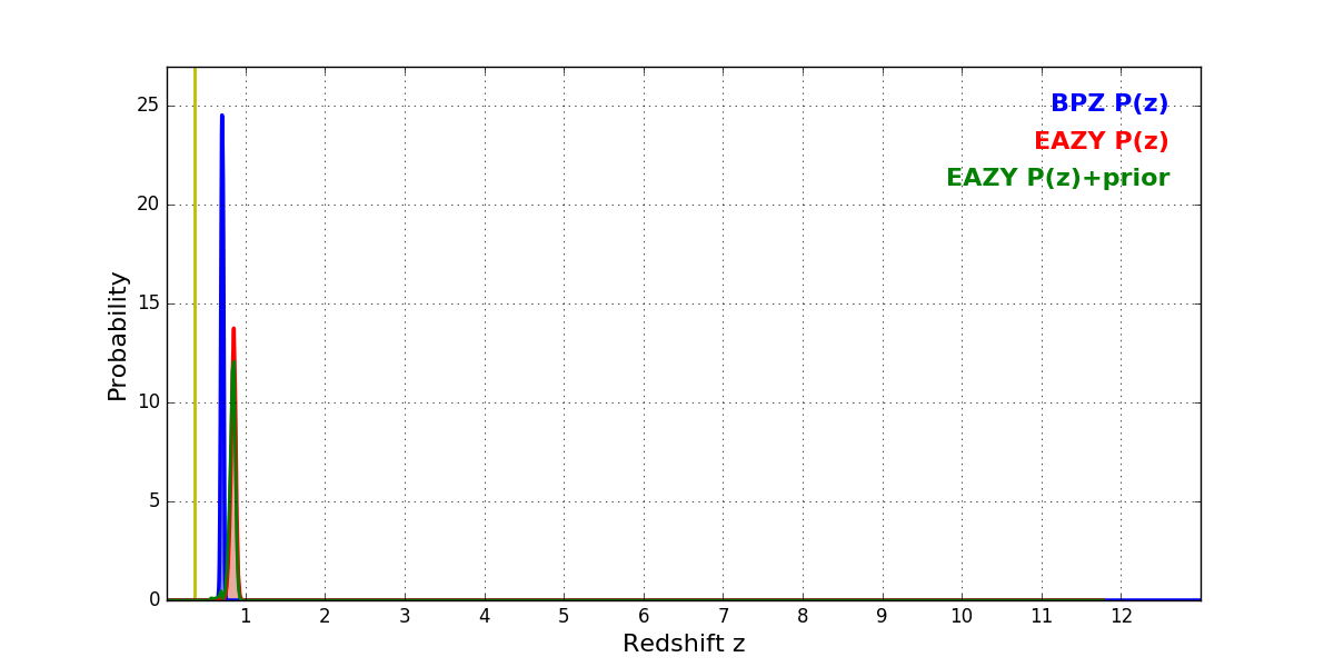 In P(z) plots: Yellow lines mark the cluster redshift z = 0.356,