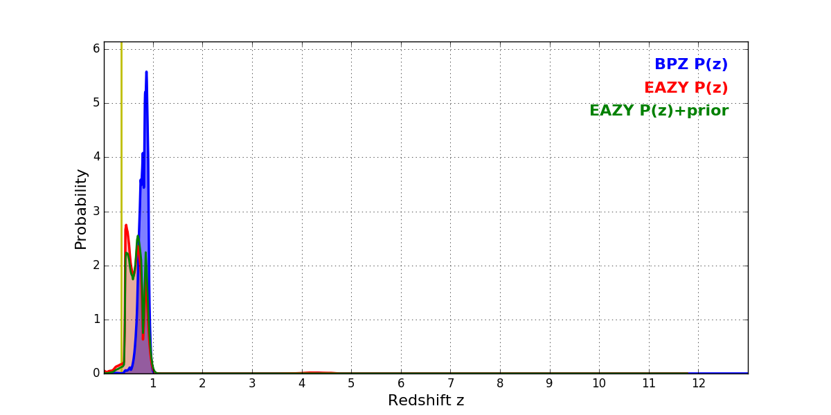 In P(z) plots: Yellow lines mark the cluster redshift z = 0.356,