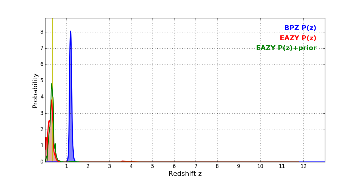 In P(z) plots: Yellow lines mark the cluster redshift z = 0.356,