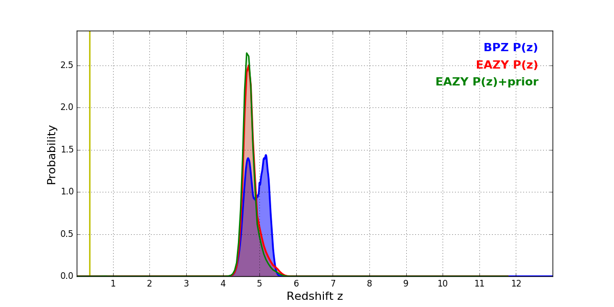In P(z) plots: Yellow lines mark the cluster redshift z = 0.356,