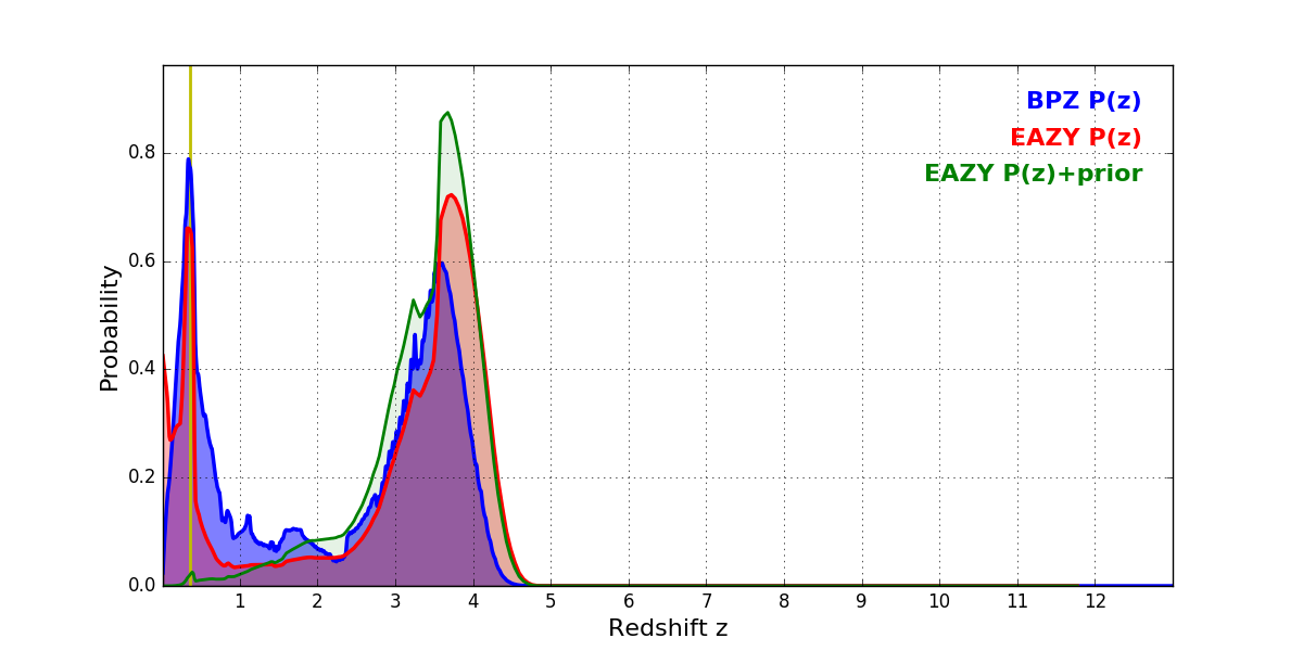 In P(z) plots: Yellow lines mark the cluster redshift z = 0.356,