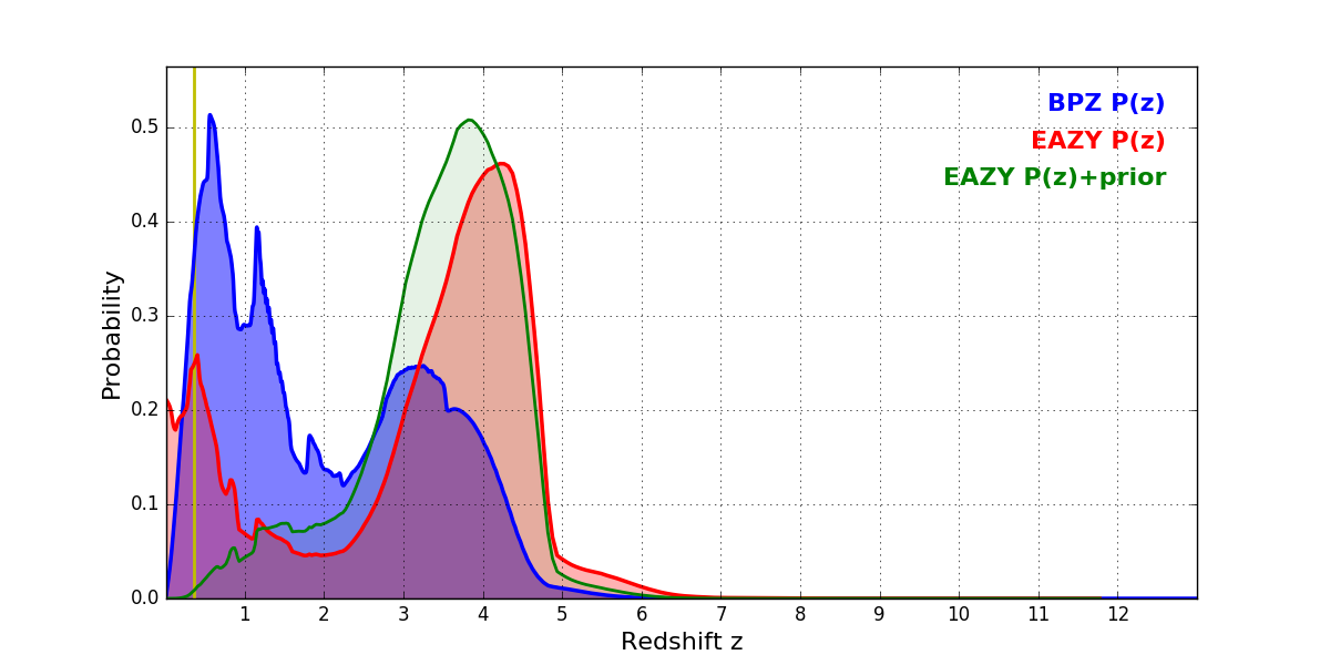 In P(z) plots: Yellow lines mark the cluster redshift z = 0.356,