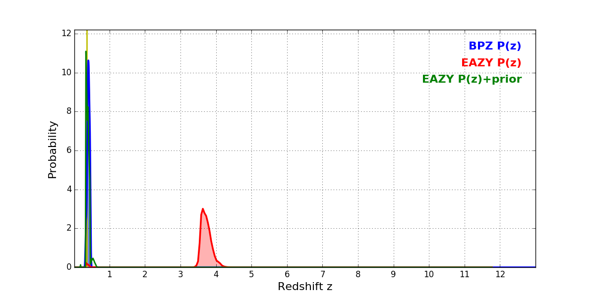 In P(z) plots: Yellow lines mark the cluster redshift z = 0.356,