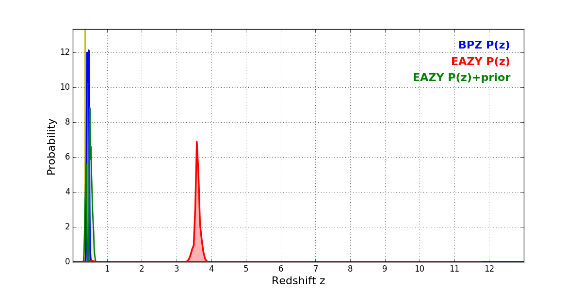 In P(z) plots: Yellow lines mark the cluster redshift z = 0.356,
